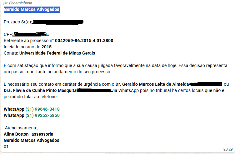 Após o contato inicial, os criminosos exigem o pagamento de “tributos” ou “custas” fictícias para a liberação do dinheiro. Isso é um golpe. Fique atento(a) nem o APUBH, nem o Escritório Geraldo Marcos Advogados enviam mensagens por WhatsApp referentes a ações na justiça.