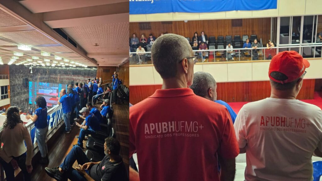 Na terça-feira, dia 02/12/2025, o APUBHUFMG+ se fez mais uma vez presente na luta contra a privatização da Companhia de Saneamento de Minas Gerais (COPASA). Na ocasião, o sindicato foi representado por seu presidente, o Prof. Helder de Figueiredo e Paula, por seu assessor político, Prof. Adelson Fernandes Moreira, e pelo Prof. Henrique Pimenta Barroso Magalhães, que pertence ao Conselho de Representantes da entidade. Os três participaram de mais uma ação de pressão popular para evitar a aprovação, na Assembleia Legislativa de Minas Gerais (ALMG), da proposta de privatização da COPASA enviada como projeto de lei (PL 4380/25) pelo Governador Bolsonarista e Ultraliberal de Minas Gerais, Romeu Zema. Junto às trabalhadoras e aos trabalhadores da COPASA e a lideranças de movimentos sindicais e populares, os representantes do APUBHUFMG+ acompanharam, da galeria do plenário da ALMG, a sessão de votação, em 1º turno, do PL 4380/25.