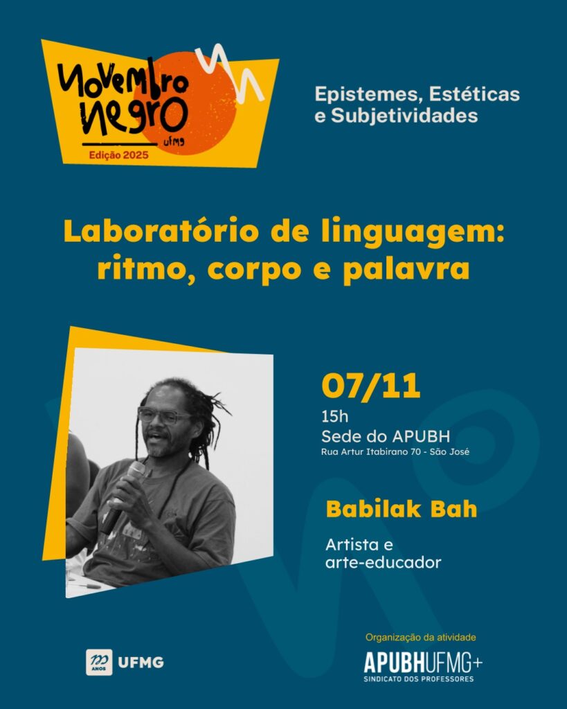 E o Laboratório de linguagem: ritmo, corpo e palavra, é aberto a professores e professoras, no dia 07 de novembro de 2025, das 15h às 17h, na Sala de reuniões Prof. Elias Antônio Jorge – Sede do APUBHUFMG+ (Rua Artur Itabirano, 70 – São José / Pampulha)