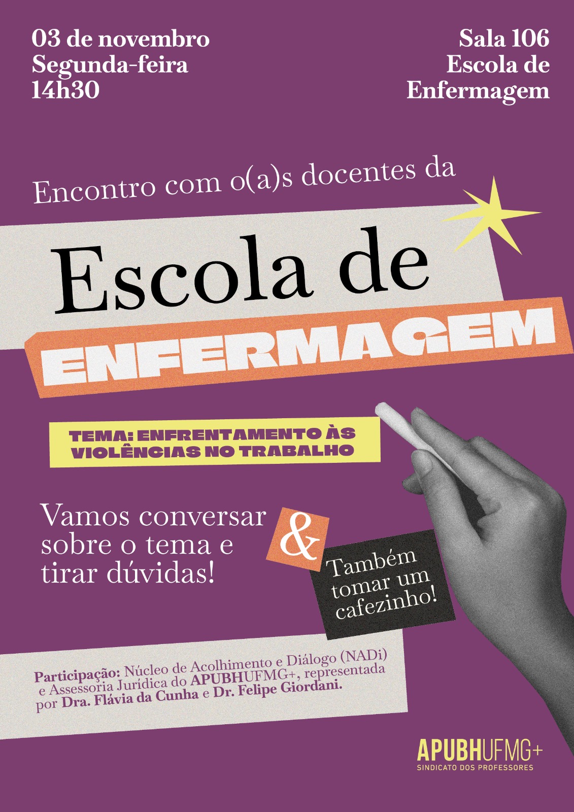 Dando continuidade às visitas às unidades acadêmicas, o APUBH estará presente na Escola de Enfermagem no próximo dia 03 de Novembro abrindo espaço de escuta e diálogo sobre uma temática muito importante para o contexto de trabalho acadêmico: “As violências no ambiente laboral”.