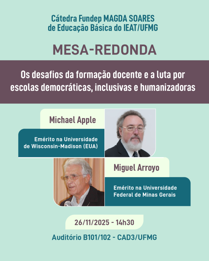 Os professores eméritos Michael Apple, da Universidade de Wisconsin-Madison, e Miguel Arroyo, da Faculdade de Educação da UFMG, estarão juntos no dia 26 de novembro de 2025, em evento promovido pela Cátedra FUNDEP Magda Soares de Educação Básica do IEAT/UFMG e pelo Sindicato dos Professores de Universidades Federais de Belo Horizonte, Montes Claros e Ouro Branco (APUBHUFMG+).