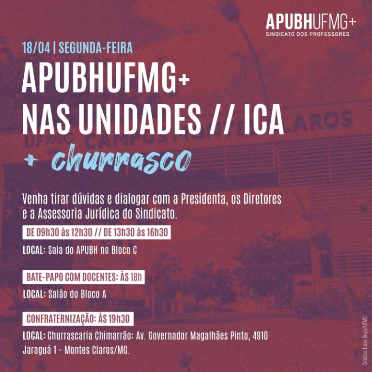 APUBHUFMG+ convida docentes do ICA: APUBHUFMG+ nas Unidades + Churrasco, no dia 18/04
