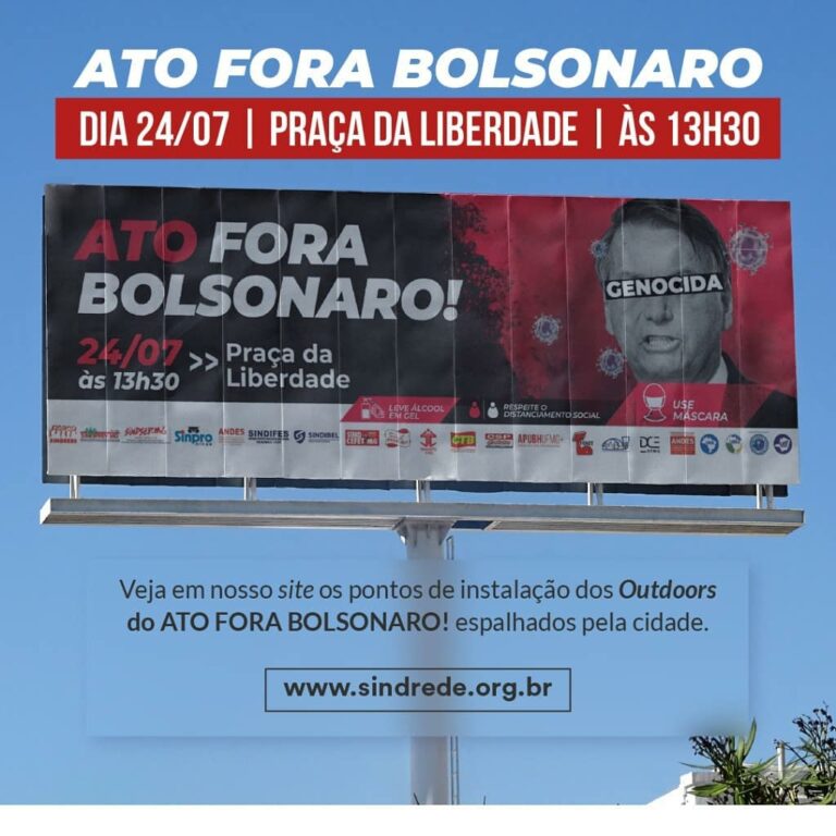 24J | APUBH, Sind-REDE, Centrais e Entidades Sindicais e Estudantis divulgam outdoors chamando o ato Fora Bolsonaro do próximo sábado (24/7)
