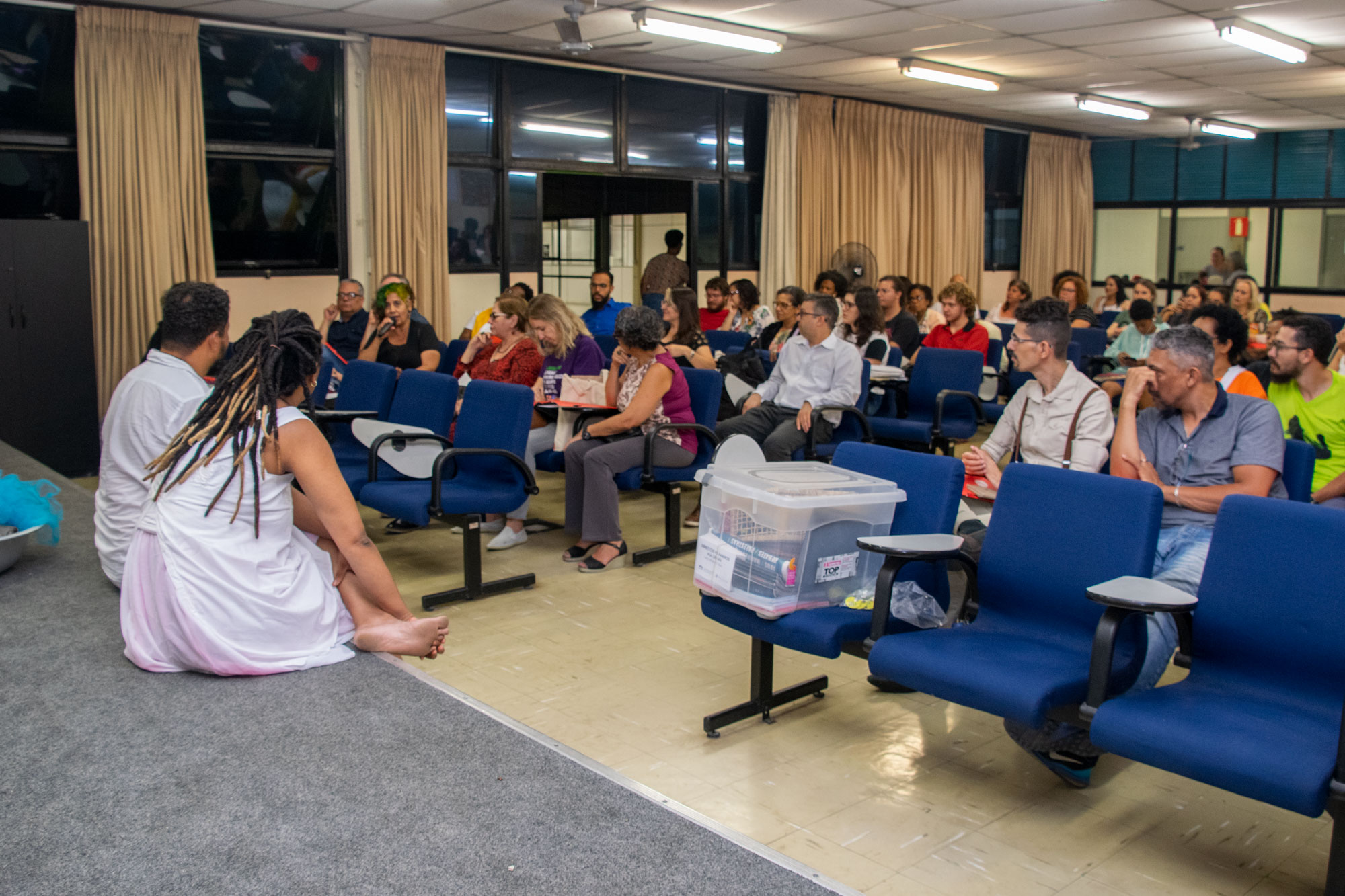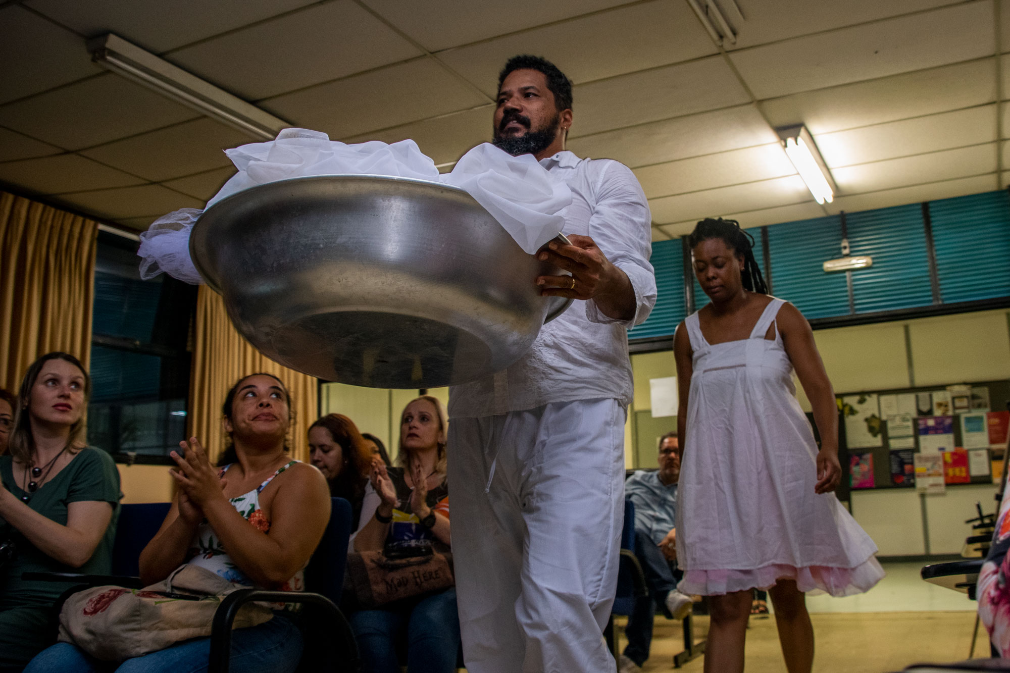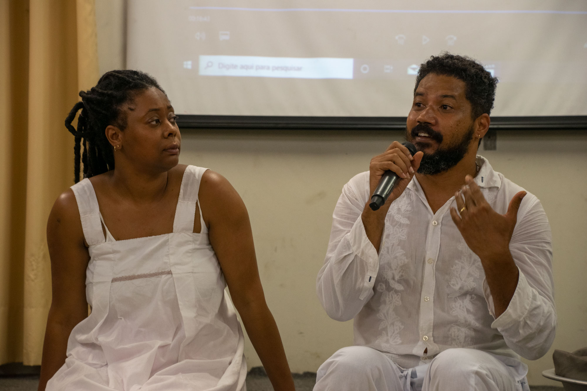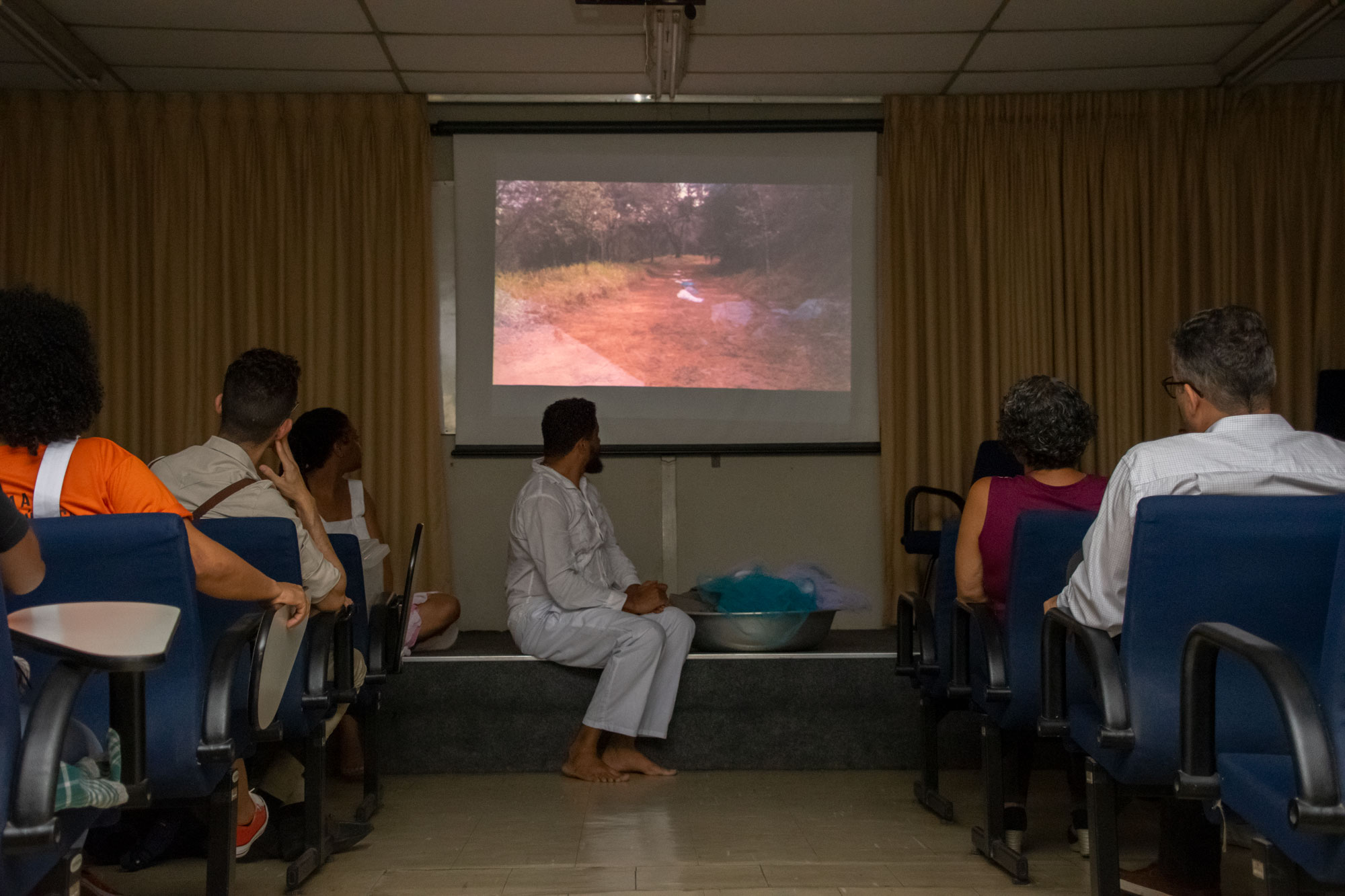Na última noite (29/11) da 1ª Semana Negra do APUBH, Janaina Barros e Wagner Leite Viana, docentes da Escola de Belas-Artes (EBA/UFMG), realizaram a videoperformance “Processo mau-olhado bem olhado: oração sobre nossas águas”, no Auditório Luiz Pompeu de Campos da Faculdade de Educação (FaE/UFMG).