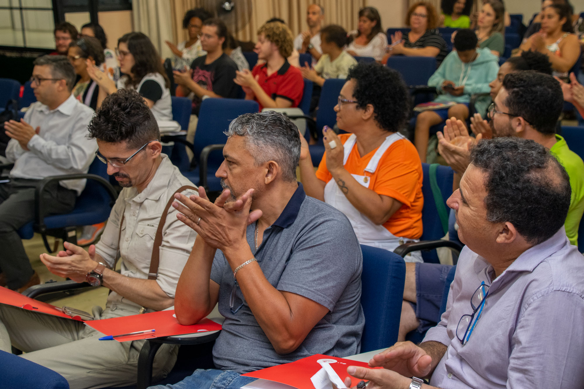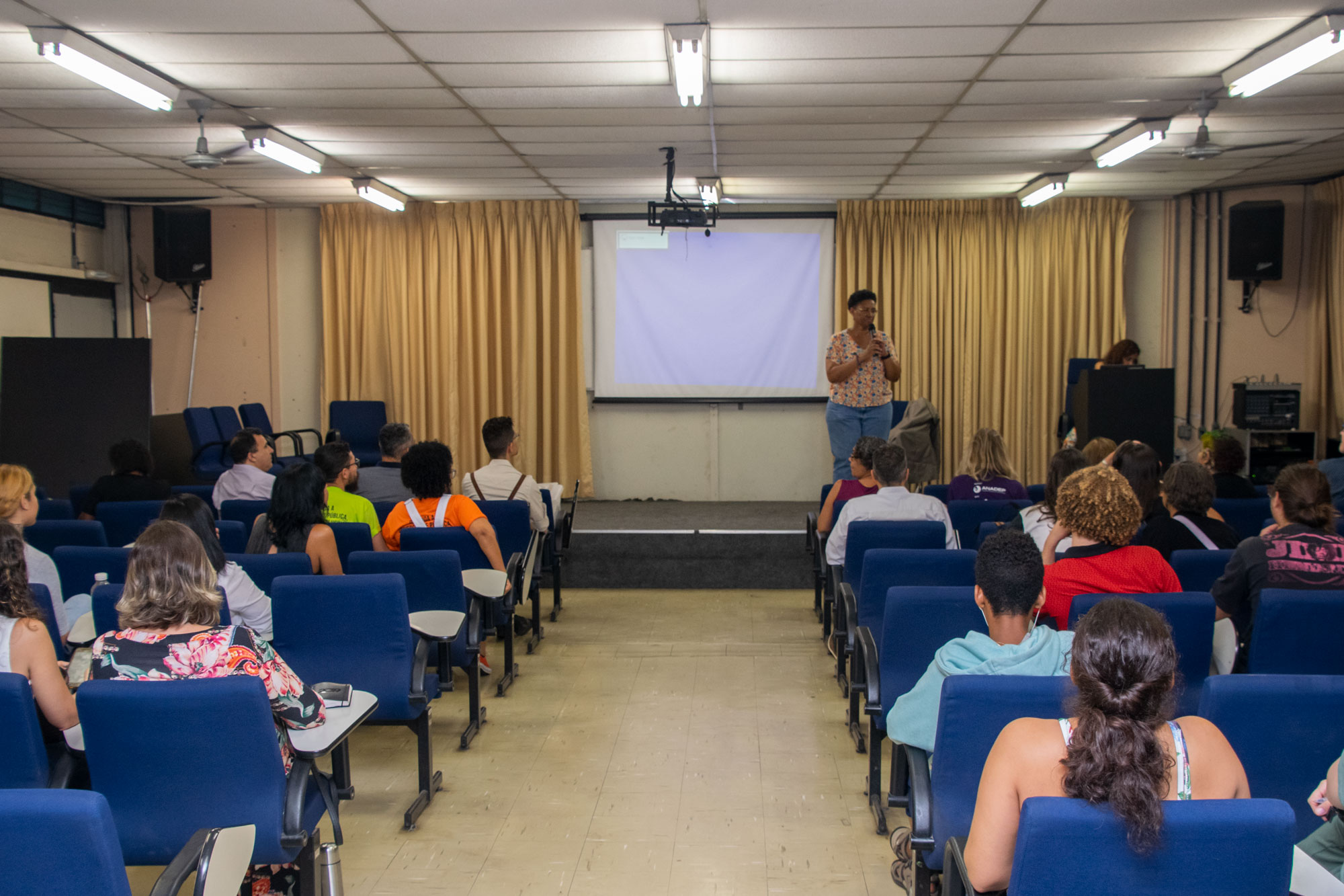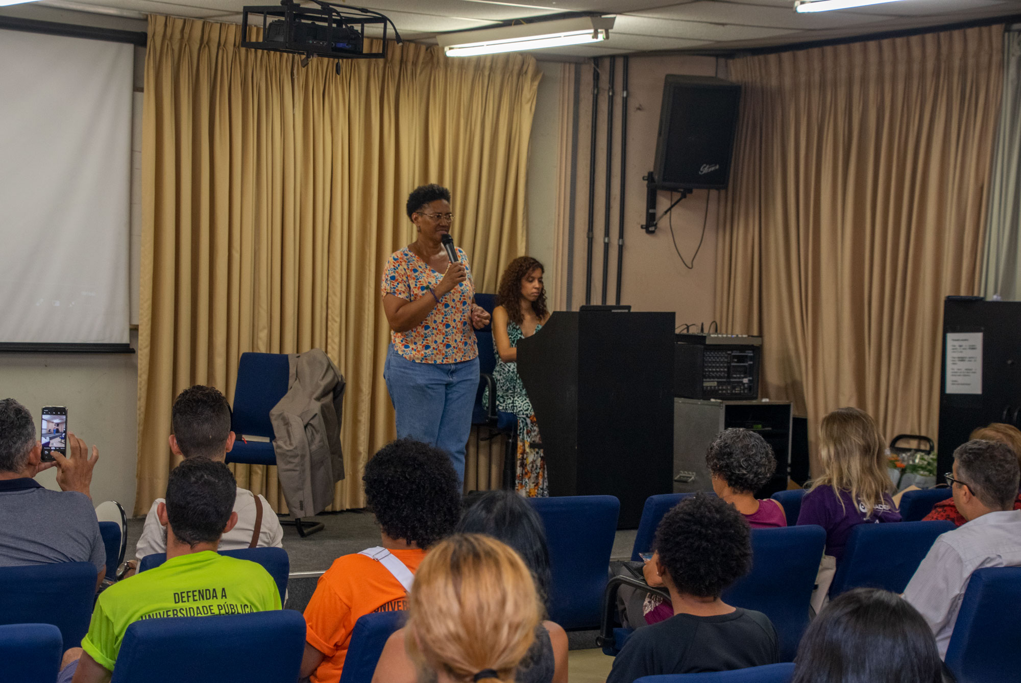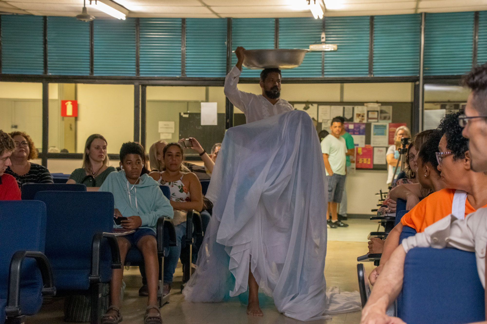 Na última noite (29/11) da 1ª Semana Negra do APUBH, Janaina Barros e Wagner Leite Viana, docentes da Escola de Belas-Artes (EBA/UFMG), realizaram a videoperformance “Processo mau-olhado bem olhado: oração sobre nossas águas”, no Auditório Luiz Pompeu de Campos da Faculdade de Educação (FaE/UFMG).