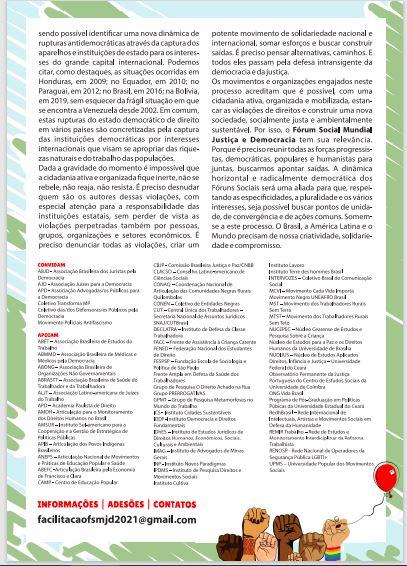 A Associação Brasileira de Juristas pela Democracia (ABJD) convida para o lançamento virtual do Fórum Social Mundial Justiça e Democracia (FSMJD), no dia 22 de novembro, às 11h, em link a ser disponibilizado em breve.