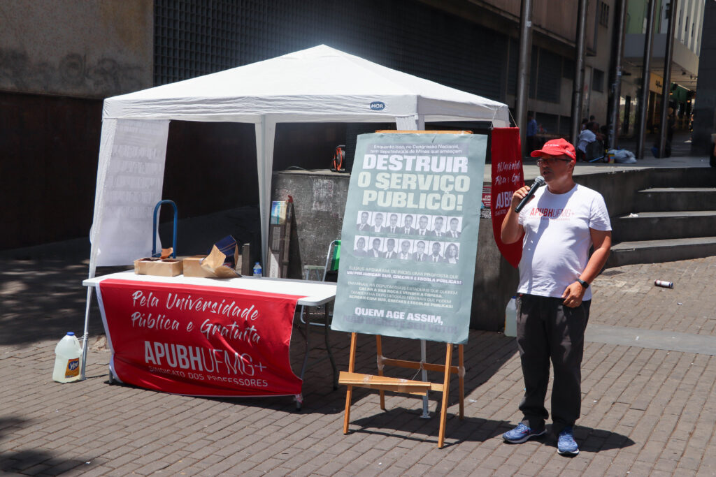 No Centro de Belo Horizonte, montamos um espaço para panfletagem e diálogo com a população. A tenda foi montada na Praça 7, nas partes da manhã e da tarde, em parceria com o Coletivo Alvorada e o SINDÁGUA | Foto: Acervo do APUBHUFMG+.