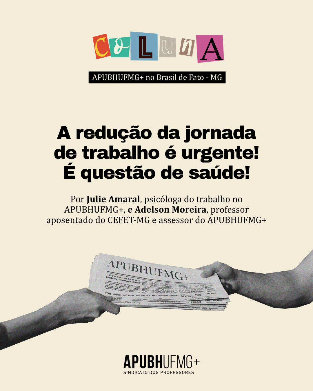 Texto de Julie Amaral, psicóloga do trabalho no APUBHUFMG+, e Adelson Moreira, professor aposentado do CEFET-MG e assessor do APUBHUFMG+, publicado no dia 19/11/2025, na Coluna Educação, Ciência, Tecnologia, Cultura e Artes em Pauta, espaço do  APUBHUFMG+  no sistema de comunicação Brasil de Fato (BdF)MG. A coluna se “destaca pela pluralidade de vozes e pela diversidade de colunistas que atuam em diferentes áreas do conhecimento e discutem questões contemporâneas”.