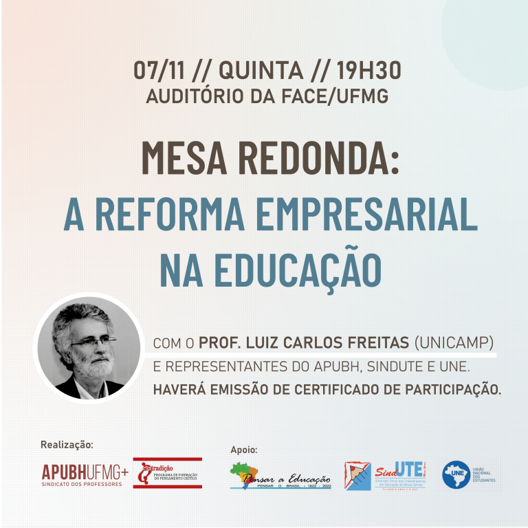 APUBH e Projeto Contradição (FACE/UFMG) realizam Mesa Redonda com o tema “A Reforma Empresarial da Educação”