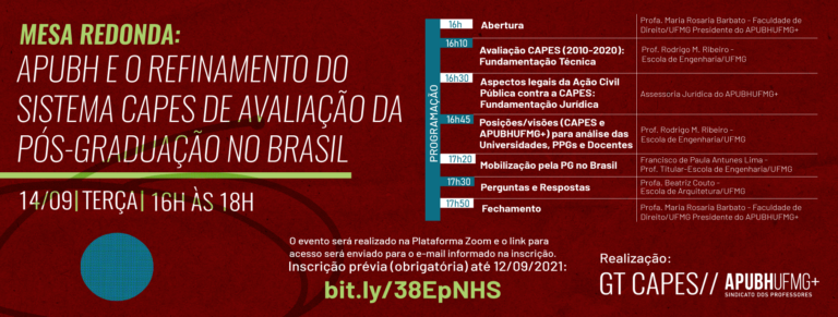 APUBHUFMG+ realizará no dia 14 de setembro a Mesa Redonda “APUBHUFMG+ e o Refinamento do Sistema CAPES de avaliação da Pós-graduação no Brasil”
